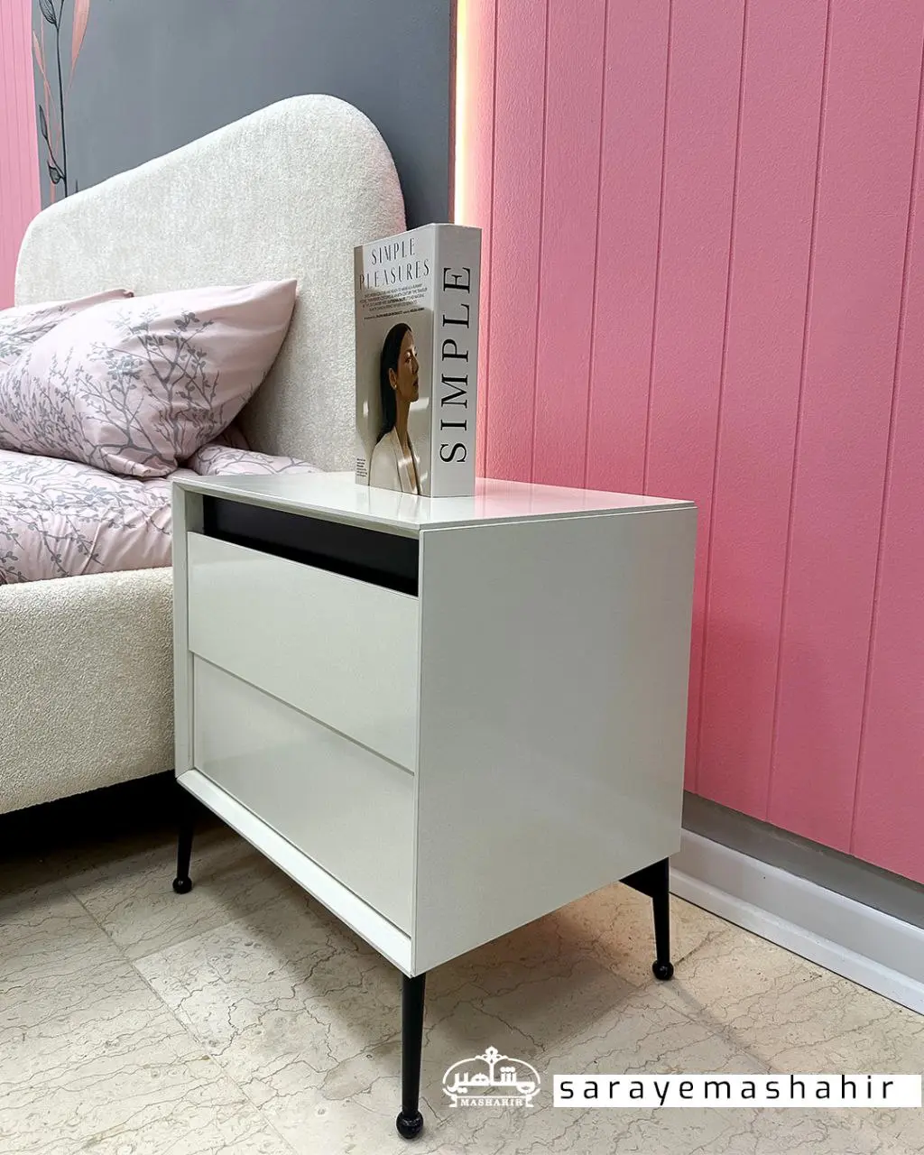 قسمت جلویی پاتختی و میزآرایش مدل تدی سرای مشاهیر شاهین شهر، از لاین هایی با رنگ مشکی طراحی شده اند که تضاد رنگی ملایم و خاصی با رنگ سفید ایجاد می کنند. این ترکیب فضای اتاق را شیک و مرتب نشان می دهد.